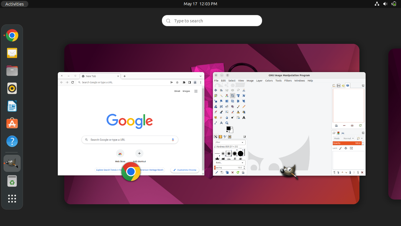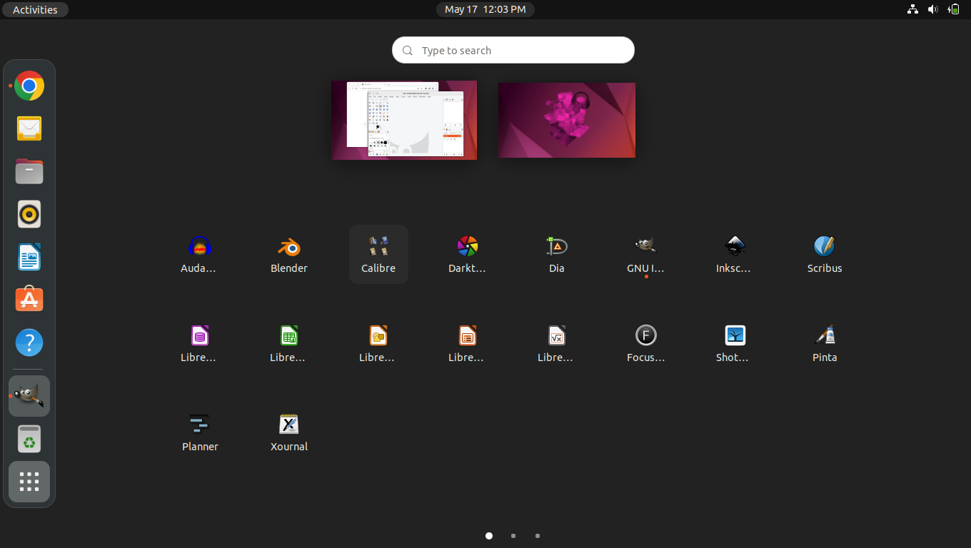 You will also find a list of available "workspaces" along the right edge. Open windows may be grouped on workspaces by simply dragging them to the desired workspace on the right. You may also switch between workspaces by simply clicking on a workspace in the overview. You can also switch workspaces up and down at any time by pressing the Super+PageUp or Super+PageDn (Super is usually the Windows key)